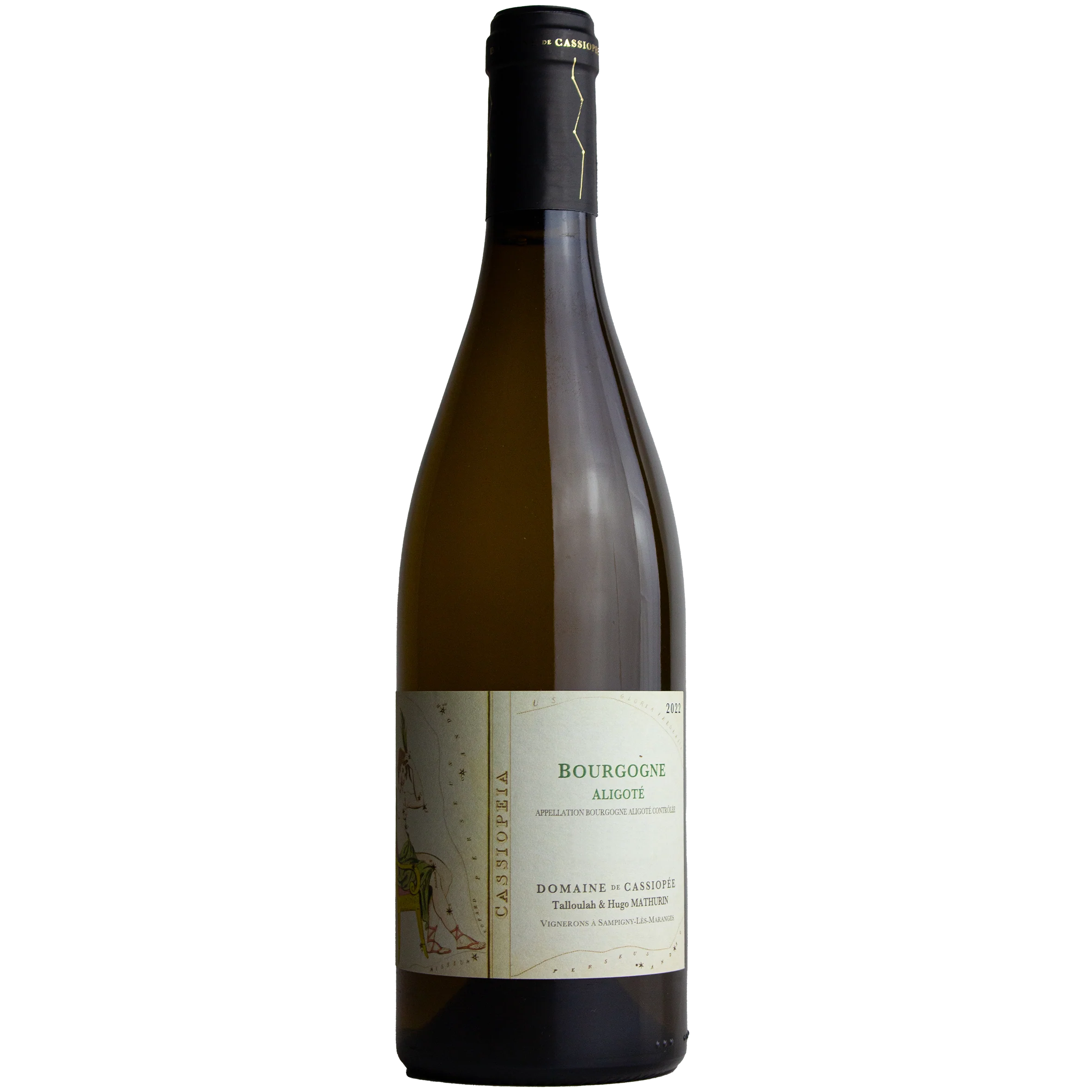 Domaine Cassiopée werd opgericht in 2020 door Talloulah Dubourg en Hugo Mathurin, twee jonge wijnmakers met ervaring bij topdomeinen in Bourgogne. Ze werken verantwoord, met respect voor bodem en plant. De Aligoté wordt handmatig geoogst, direct geperst en spontaan vergist met natuurlijke gisten. Rijping vindt plaats in een combinatie van gebruikte houten vaten en inox, zonder bâtonnage. De wijn wordt niet geklaard en nauwelijks gefilterd. Dankzij deze minimale interventie blijft de expressie van druif en bodem puur en energiek.